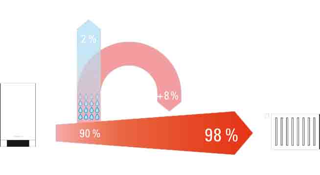 Mit dieser Technologie erreicht ein Gas-Brennwertkessel einen Norm-Nutzungsgrad bis 98% (bezogen auf Hs). Eine Gasheizung mit Brennwertkessel arbeitet dadurch besonders energiesparend, was sowohl den Geldbeutel als auch die Umwelt schont.